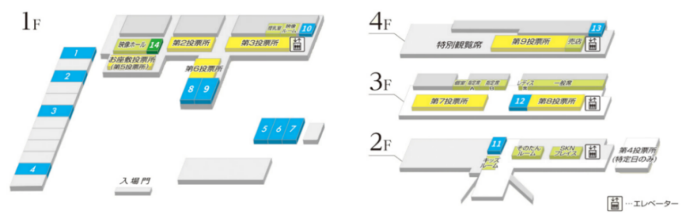 ⑧さくら ⑨マグロ専門店一八 ⑩オリーブハウス ⑪しらゆり菓子売店 ⑫レストラン ミュンヘン ⑬特別観覧席 ドン勝 ⑭そのたんSHOP