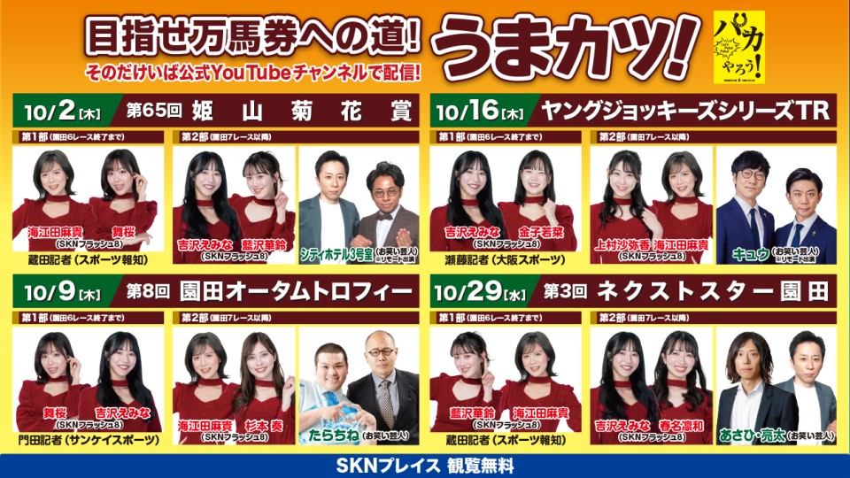 園田競馬場内「SKNプレイス」から公開LIVEを配信している「重賞予想会LIVE うまカツ!」「そのだ金曜ナイターLIVE配信」について、10月特別ゲストが決定しましたのでお知らせします。