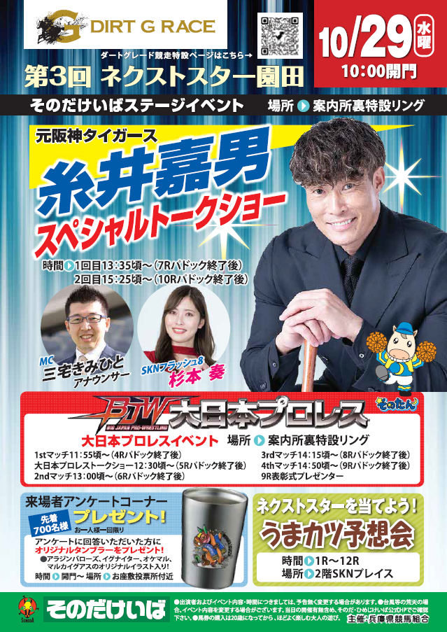10月29日(木)園田競馬場で行われるネクストスター園田当日のイベントをお知らせいたします。