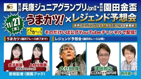 二瓶有加さん、ネイビーズアフロさん、(MC)木尾モデルさんによる、「第27回 兵庫ジュニアグランプリ(JpnⅡ)」の予想などスペシャルトークショーを行います!