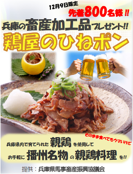 12月9日(火)に園田競馬場にご来場いただいた方に、兵庫の畜産加工品「鶏屋のひねポン」を先着800名様にプレゼントします!