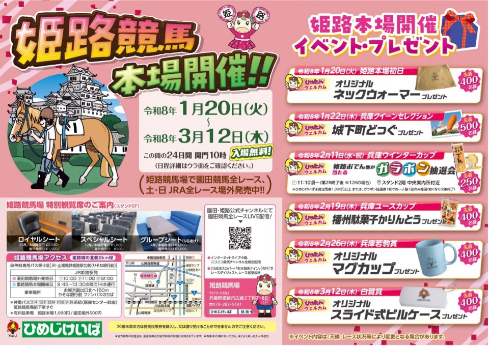 令和8年1月20日(火)から3月12日(木)までの兵庫県競馬は姫路競馬開催となります。なお、姫路競馬開催中における園田競馬場は、姫路競馬開催時のみ場外発売を実施します。