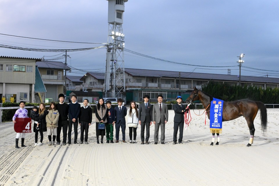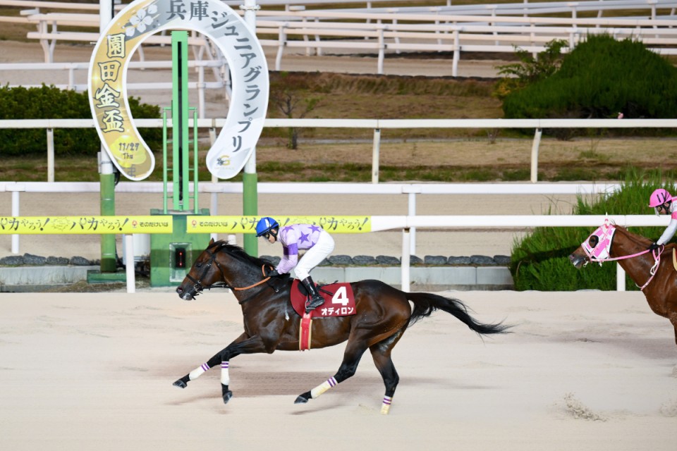 兵庫競馬の中距離王者を決める「第68回園田金盃」が27日、ファン投票で選ばれた6頭を含む12頭立てで行われ、単勝4番人気のオディロン(森沢・牡6)が直線で力強く抜け出してV。吉村智洋騎手は通算重賞53勝目、園田金盃は2勝目。管理する森沢友貴調教師は通算重賞6勝目で、園田金盃は初勝利。1番人気に推された無敗の3歳3冠馬オケマルは2着に敗れた。