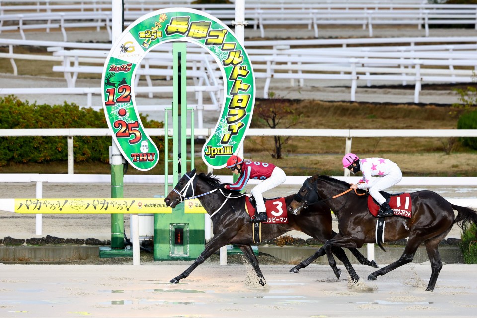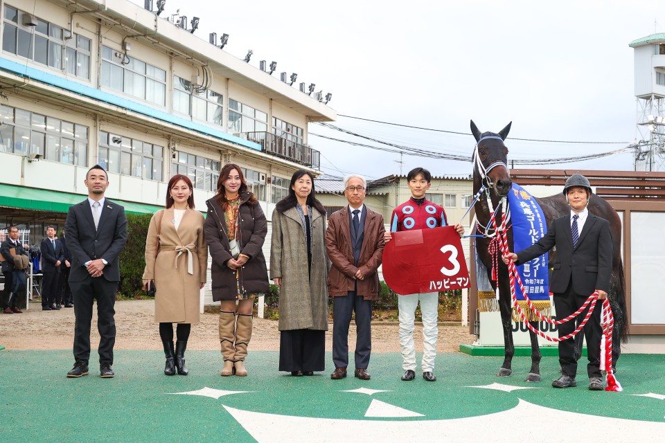 前走でシッカリと体を戻したハッピーマン。今日は更に2キロプラスでの出走。いい感じに気も入っていたし、臨戦態勢はバッチリ。好位に付けての早めインから見事なまでの抜け出し。まさに園田を知り尽くした人馬という感じがしたねェ。2着マテンロウコマンドも力は見せた。今日に限っては相手が一枚上だっただけ、最後までシッカリ伸びた。まだまだ成長する、強くなりますなぁ。この2頭とも…。3着には地元オマツリオトコ。毎度のこととはいえパドックではやたらと元気、勝ったハッピーマンが通ったコースをそのまま後ろから、この選択もよかったのだろう、値打ちのある激走だった。④着がスペシャルエックス、今日も早め早め攻めのスタイル、これまた健闘の部類だろう。そのあとがケイズレーヴ、思ったほど伸びなかったかな、水気を含んだ馬場が影響したか。地元の期待を集めたエコロクラージュは6着、伸びていないわけではないが、これまた思ったほど弾けずで…。